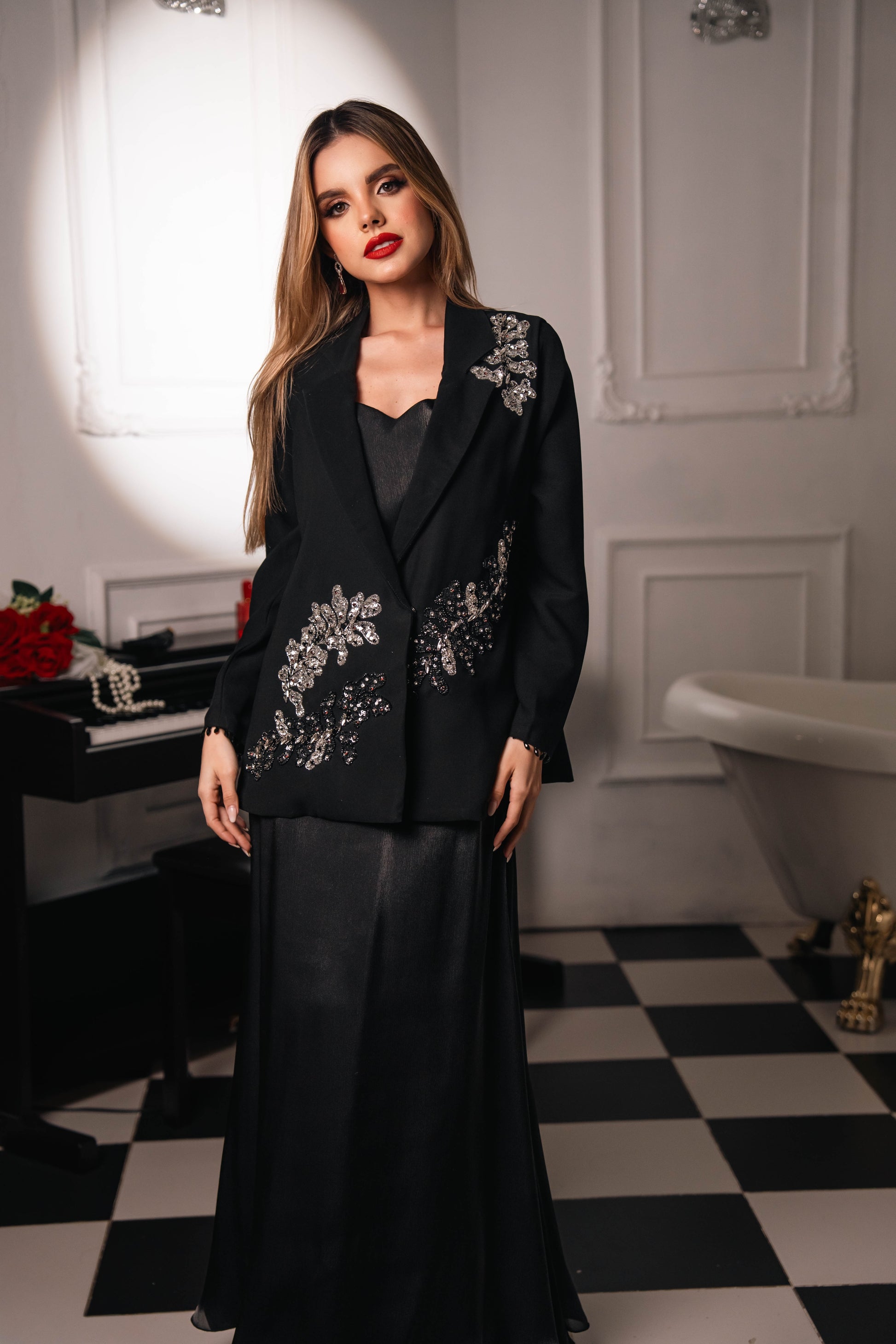 Étoffe is a masterpiece of timeless sophistication and refined drama. Draped in black heavy crepe with a soft silk organza inner, this coat is adorned with intricate silver embroidery and black sequins floral motifs, while deep maroon stones punctuate the design with striking intensity.