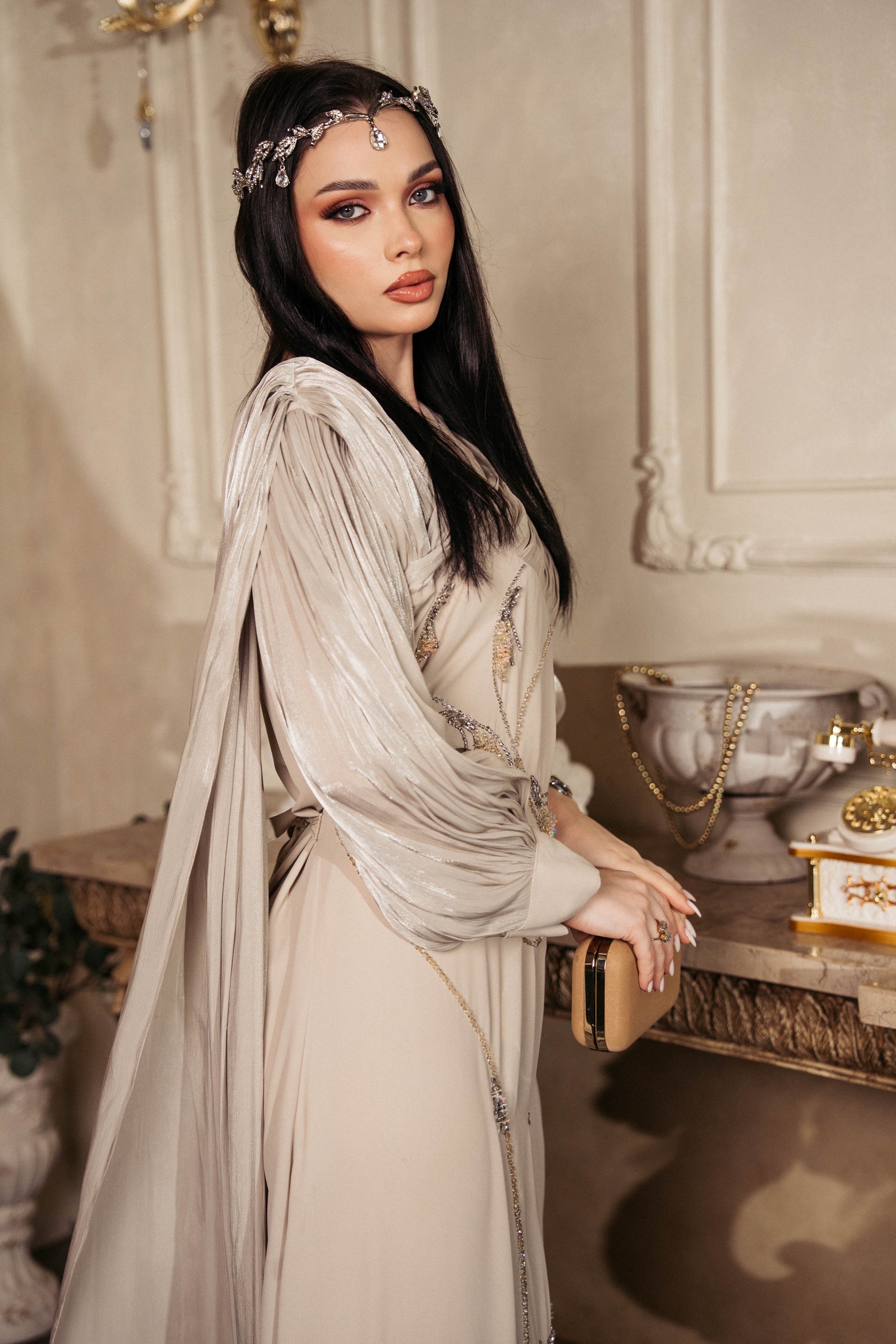 Etoile It shines in a warm beige palette with pleated sleeves and delicate beadwork. Its sculpted design and shimmering gold accent sparkles celebrity glamour, ensuri entrance-a gown designed for unforgettable red carpet moments.